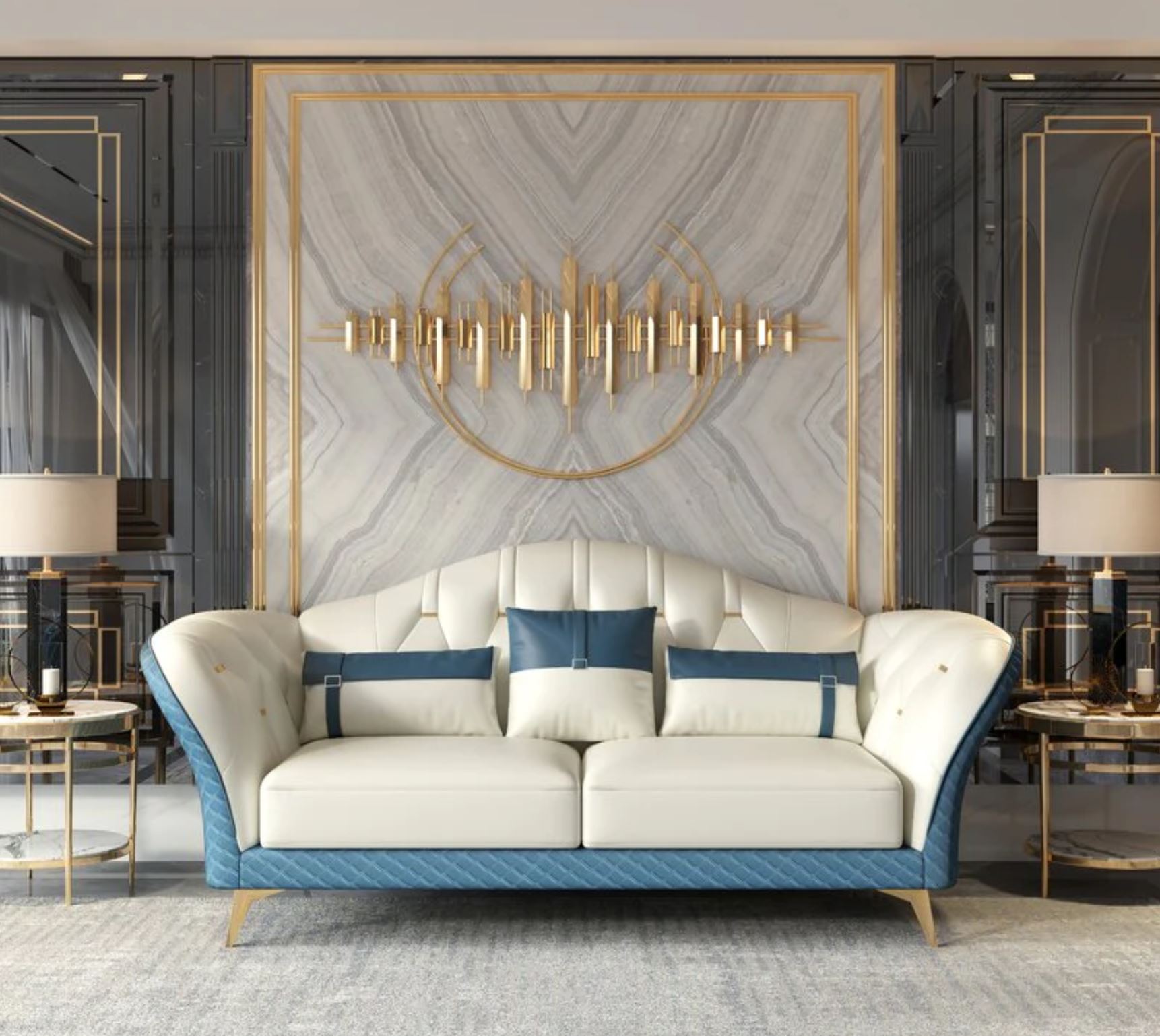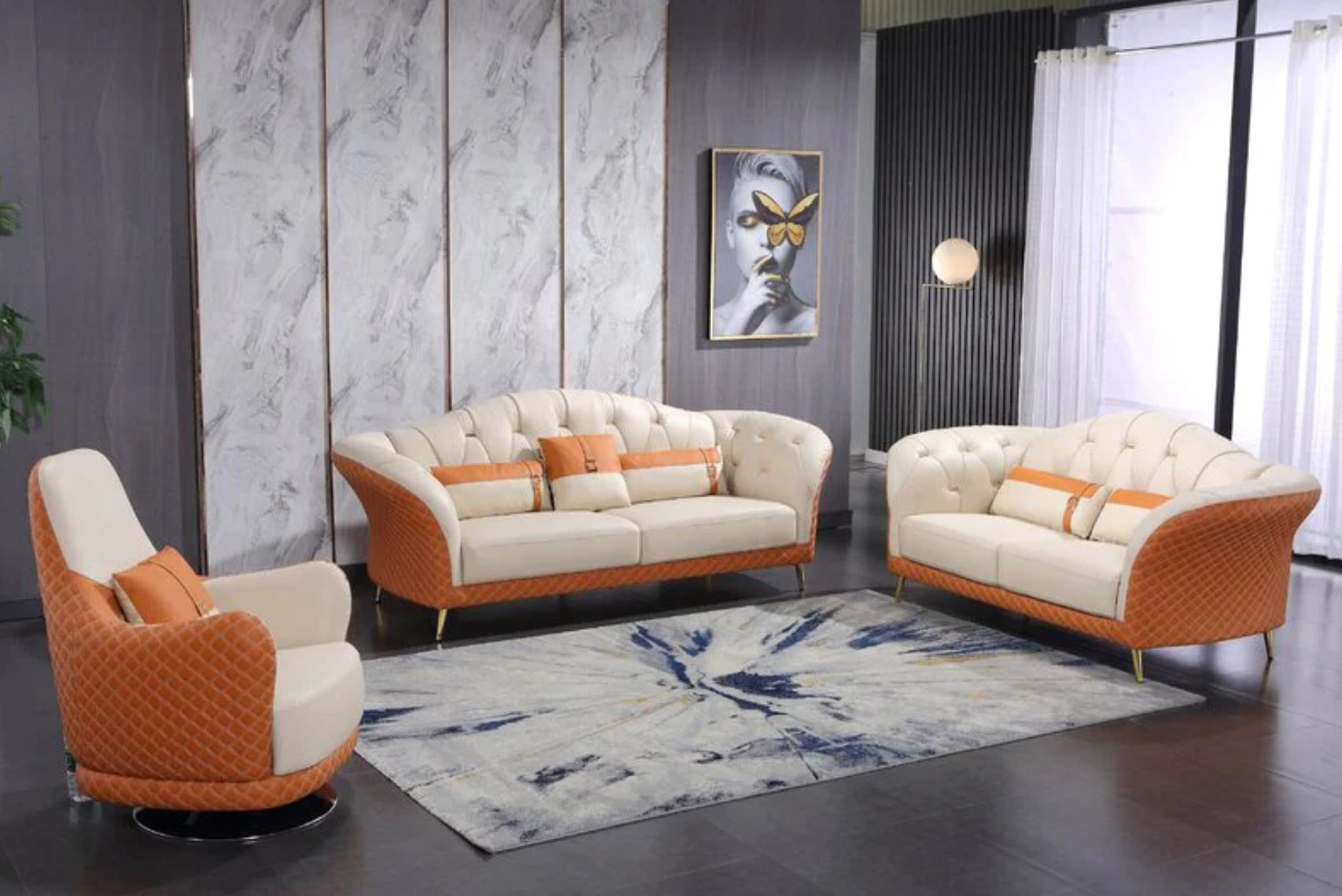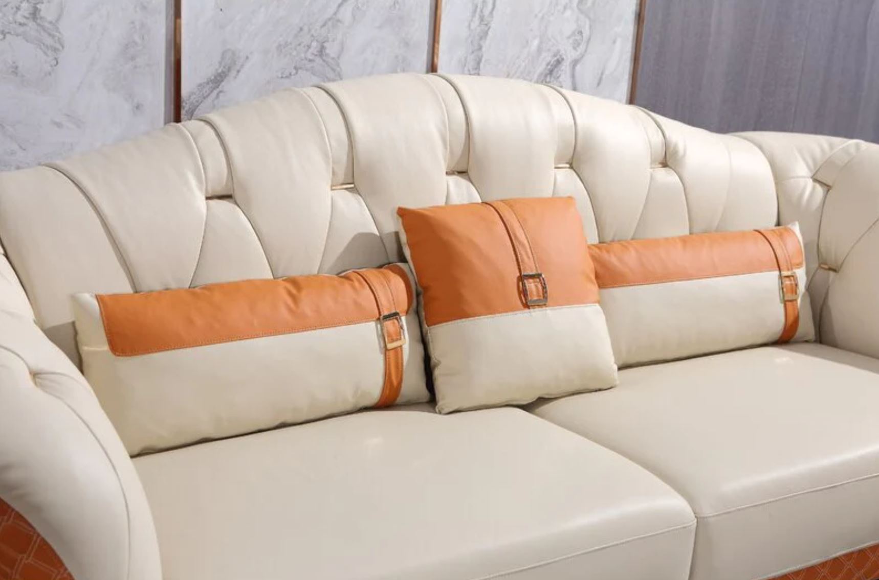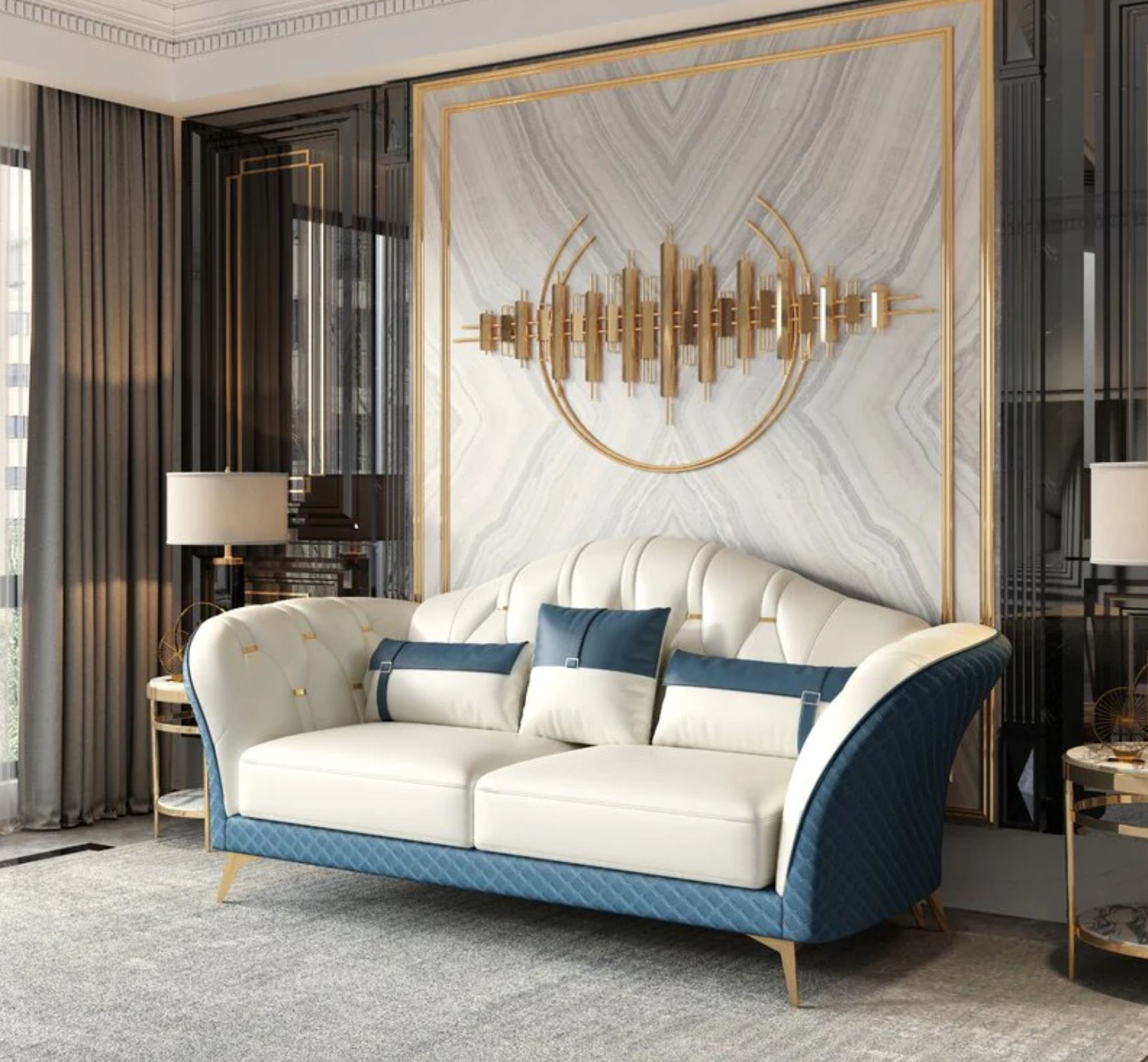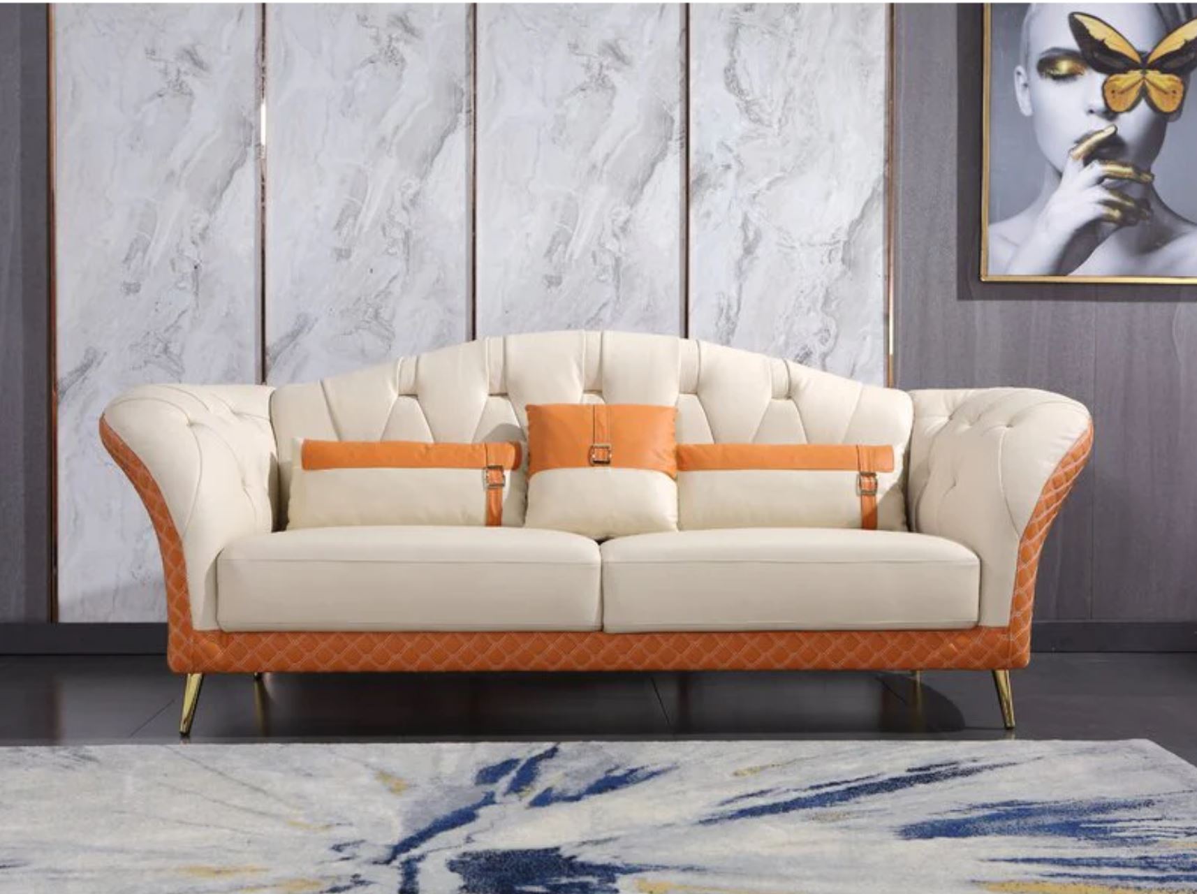 The Alankarr Rajadhan Sofa -- Crafted in top-grain tow tone leather with gold legs, the sofa will add a that combines traditional and modern look to your living space while still... 60 Months Manufacturing Warranty, Made With The Finest Materials